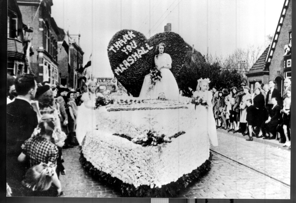 A parade float at the Dutch Flower Festival, expressing appreciation for the efforts of the Marshall Plan.”